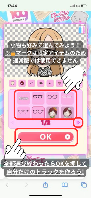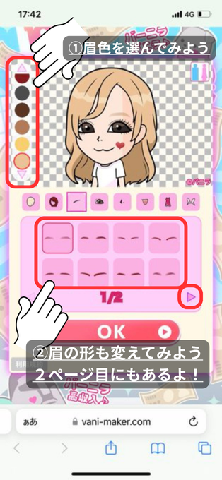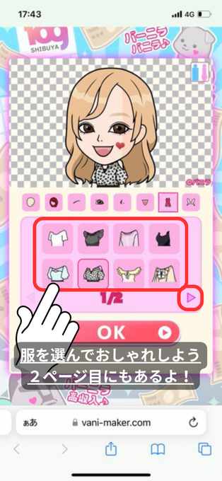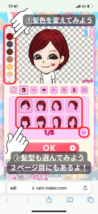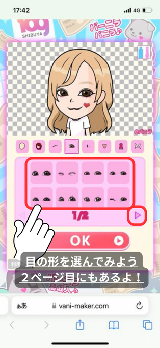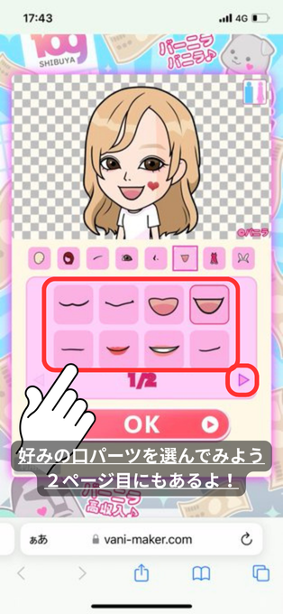 髪・目・口・服などをたくさんのパーツのなかからパーツを組み合わせて