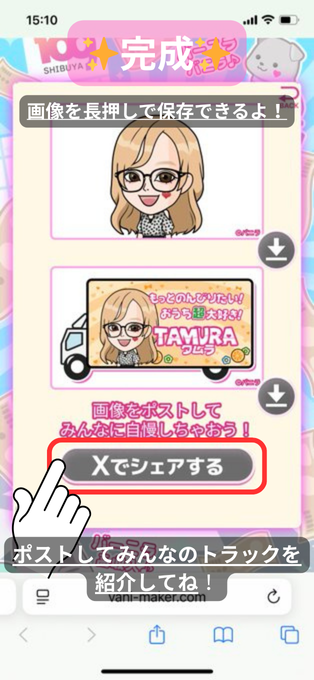 ※完成画面『Xでシェアする』から投稿でも🆗 pic.twitter.com/3CMFl4VT8t— 公式|バニ子ちゃん🚚💰 (@vanilla_qzin) October 21, 2025